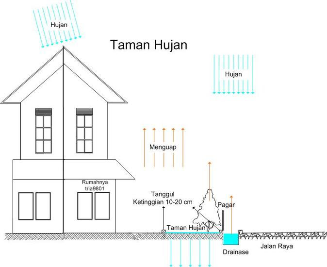 Selain rumah ntu di atas bisa dibuatkan taman hujan ternyata bisa di kombinasikan juga dengan biopori. Biopori yang ada pada lahan di atas mempunyai kedalaman 80 - 100 cm dengan diameter 10 cm yang berfungsi untuk memperbesar daya resap tanah (wuidih airnya dah semakin banyak terserap nih gan). Berikut ane tampilin lagi ilustrasi rumah yang punya taman hujan dan biopori.Spoiler for Ilustrasi taman hujan dan biopori: