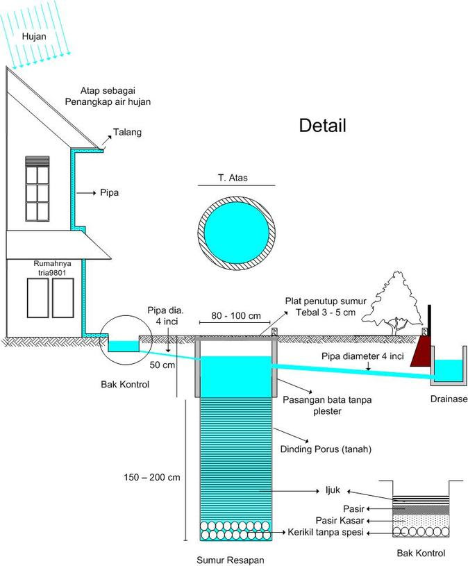 Ternyata rumah di atas masih punya semangat yang besar buat melihara air, selain pakai taman hujan dan biopori, ehhh di tambah lagi dengan sumur resapan. Sumur resapan yang dibangun dilengkapi dengan bak pengontrol yang berfungsi sebagai penyaringan air dari debu dan kotoran-kotoran yang terbawa dari atap biar aqifer kite-kite tidak tercemar. Kite-kite liat ilustrasinya lagi yuk kalau ditambah dengan sumur resapan juga.Spoiler for Ilustrasi taman hujan, biopori dan sumur resapan: