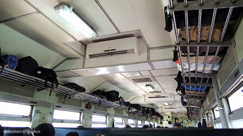 Ini pertama kalinya gw naek K3 siang hari. sebenernya gw dah jiper duluan, tapi karena K3 ke Surabaya cuma berangkat siang (GBMS dan Kertajaya), mau ga mau harus gw jalani juga. gw sih ga yakin walopun dah pake AC bakalan adem, karena berdasarkan pengalaman gw sebelomnya naek K3 malem, tetep aja ACnya kurang berasa. bayangin ajalah sendiri, 6 unit AC Split bwt 106 orang penumpang...